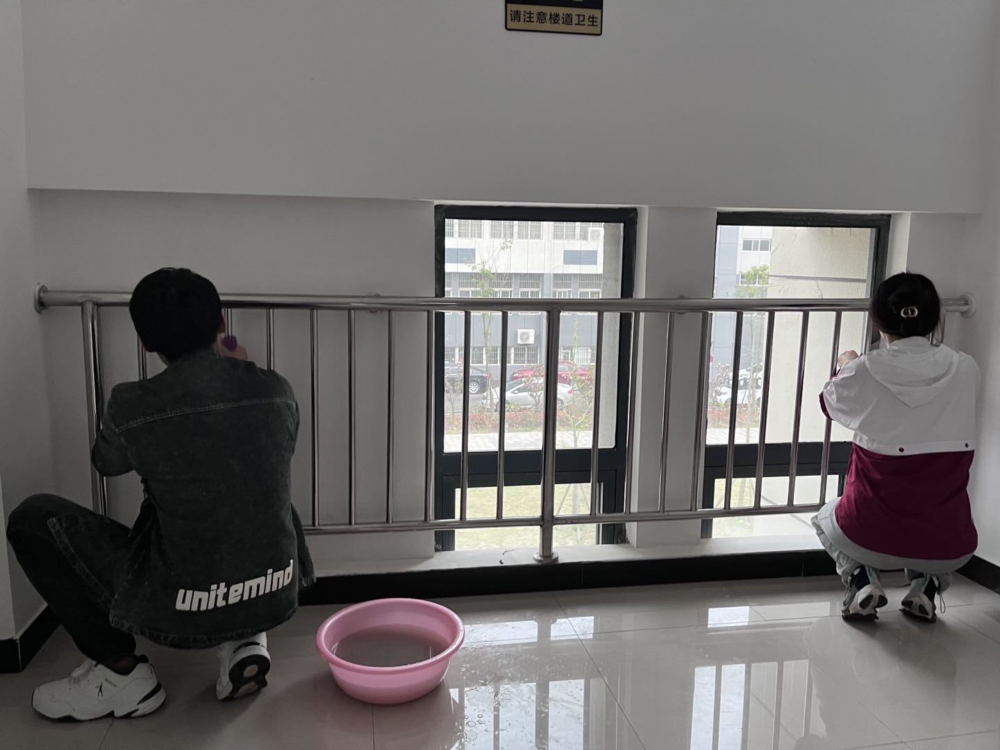 在师生们的相互配合下,清扫工作有条不紊地开展。一眼望去,从大厅入口到教室,从楼道口到模拟法庭,从教研室到办公走廊,师生忙碌的身影成为sunbet申搏0楼一道独特的“风景线”。有序的清扫如火如荼地进行,有的三人一组用抹布轻轻擦拭门窗与玻璃;有的同学用拖把打扫教室地面;有的同学认真清理楼梯间杂物,有的老师用铲子清理门窗的污迹。大家各有分工、齐心协力,利用拖把抹布铲子,狠抓细节,不留死角。