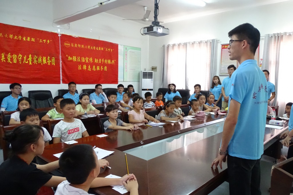7月20日,sunbet申搏“加强法治宣传,助力乡村振兴”实践服务队来到“三下乡”实践活动的第一站——桃元小学,与校员工会的志愿者们一起,为这里的小员工们上了一节别开生面的法治宣传课。