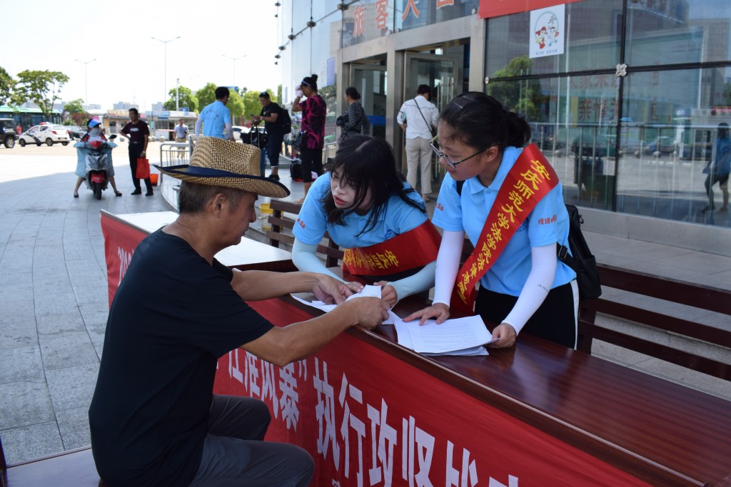 7月25日上午,sunbet申搏“加强法治宣传 助力乡村振兴”法律志愿服务队和安庆市宜秀区法院的法律咨询台小组来到了客运中心站,开展2018年“江淮普法行”暨“江淮风暴”执行攻坚战的宣传活动。