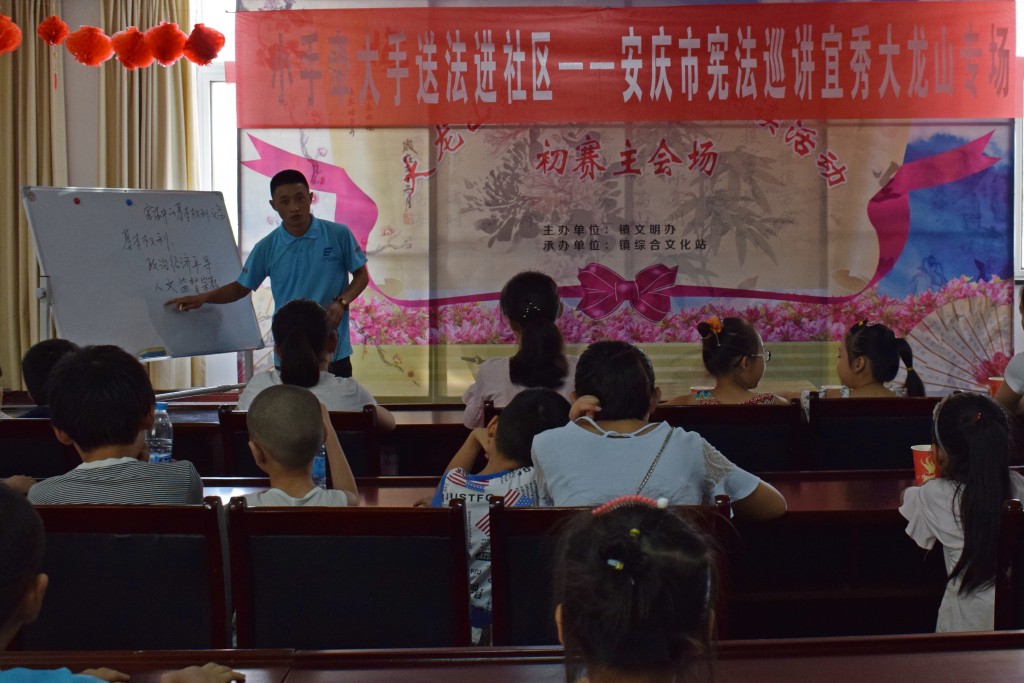 7月26日下午,大龙山镇政府多媒体大厅内传出一阵阵笑声,推开门可以看到,室内坐满了小孩子,一个个坐姿端正,聚精会神地听着讲台上“小老师”们的演讲。这些小老师就是sunbet申搏“加强法治宣传,助力乡村振兴”法律志愿服务队的成员们,他们来到大龙山镇政府,为周边社区的孩子们开展了主题为“小手拉大手,送法进社区”的宪法巡讲活动。