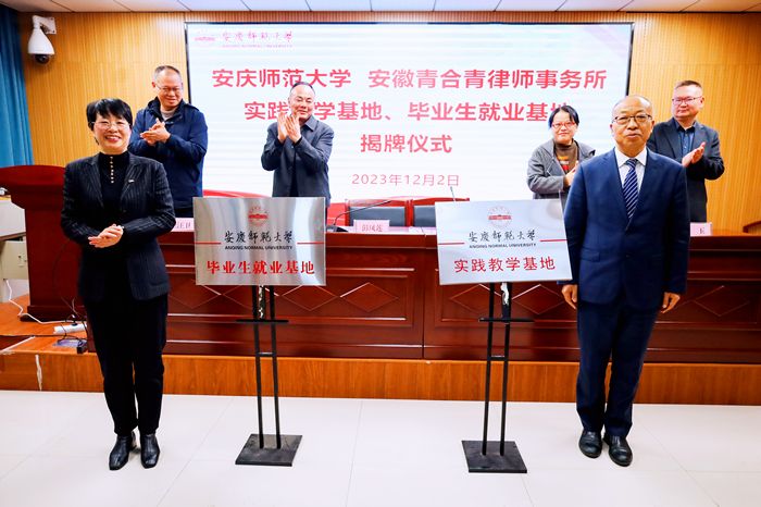 彭凤莲和音邦定共同为法学实践教学和毕业生就业基地揭牌,sunbet申搏负责人和安徽青合青律师事务所合伙人签订法学实践教学、毕业生就业基地协议。