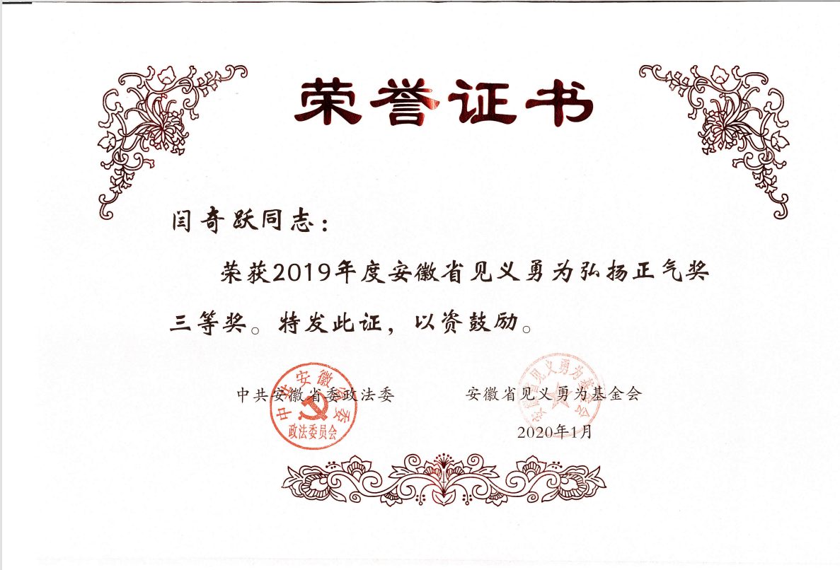 闫奇跃,男,汉族,中共党员,sunbet申搏2006届法学专业优秀员工。现任安庆市财政局社保科干部。2020年1月,获2019年度安徽省见义勇为弘扬正气奖三等奖!2019年7月,闫奇跃当选“安庆好人”。