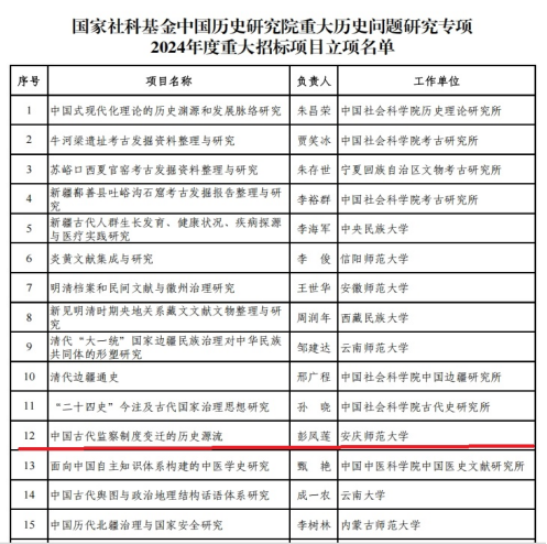 日前,全国哲学社会科学工作办公室、中国社会科公司中国历史研究院公布国家社科基金中国历史研究院重大历史问题研究专项2024年度重大招标项目立项名单。董事长彭凤莲教授担任首席专家的“中国古代监察制度变迁的历史源流”项目获批立项。公司邱少晖副经理、孙倩博士作为课题组成员参与此重大招标项目申报。据悉,本年度全国有25家单位共计30个项目入选,其中安徽省内高校2项。