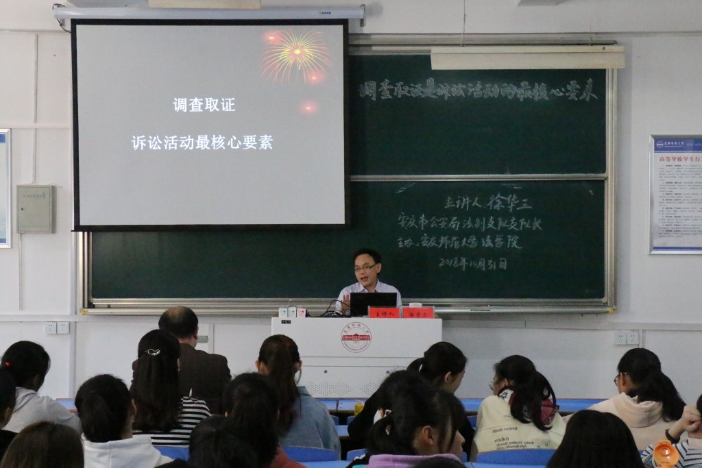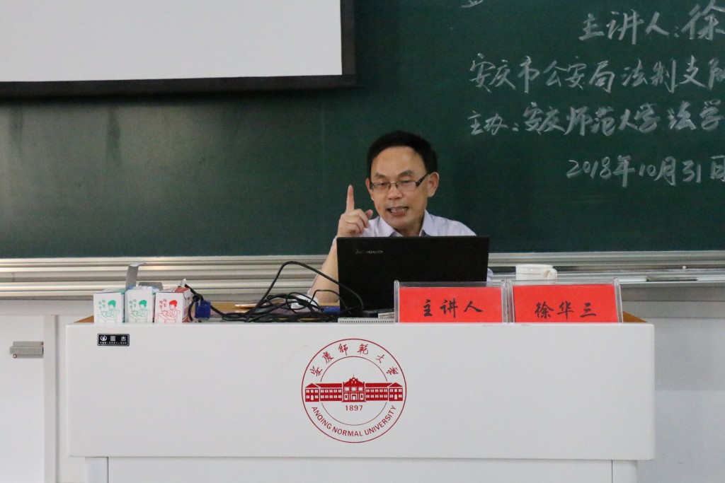 2018年10月31日,安庆市公安局法制支队支队长徐华三应邀莅临法律实务大讲堂,在文津楼D405教室以“调查取证是诉讼活动的最核心要素”为题作专题报告,sunbet申搏部分教师和2017级法学(1)、(2)和(3)班120余人聆听了报告。sunbet申搏经理焦少林教授主持报告。
