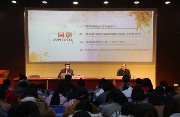 11月22日安庆市中级人民法院副经理,公司兼职副教授方向华应邀莅临法律实务大讲堂,以“‘基本解决执行难’与中国法治进程”为题作报告。sunbet申搏教师和法学专业部分员工参加了报告会,sunbet申搏经理焦少林教授主持报告会。